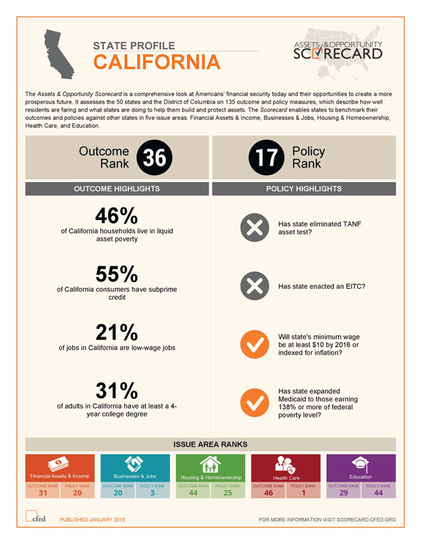 And the need for these alternative financial institutions in California is critical. Despite recent upticks in our economy nationwide, things are still very tough in the Golden State. New data released by the Corporation for Enterprise Development (CFED) show many Californians are still struggling to gain a foothold in the economic recovery. CFED’s 2015 Assets & Opportunity Scorecard ranked California 50th among all states and the District of Columbia, for its large number (15.8 percent) of underemployed workers, 49th for both its home ownership and housing affordability rates, and dead last (51st) for high school degree attainment.
