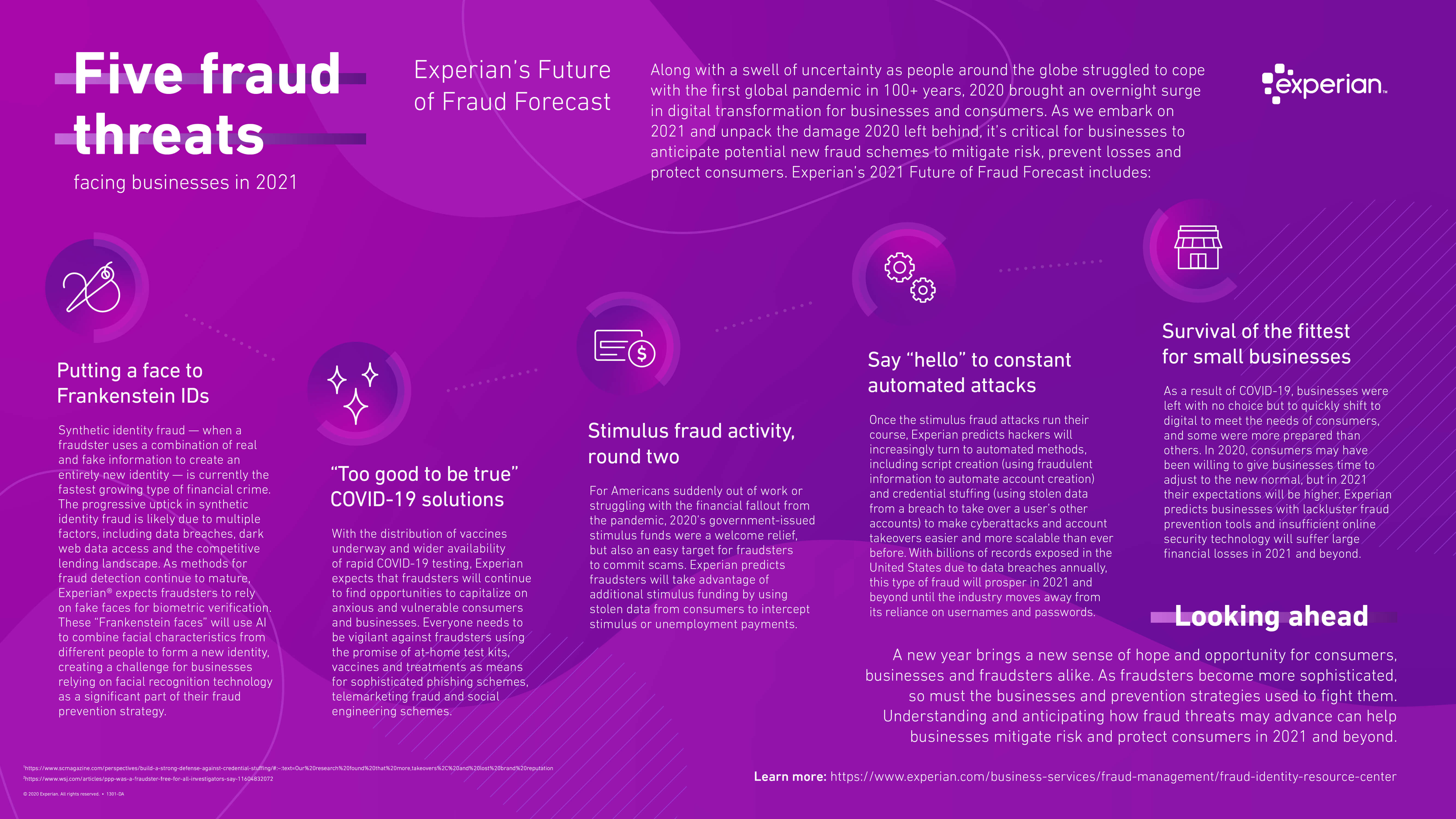 While fraudsters will iterate on new and old methods of attack in 2021, Experian is always innovating to help businesses stay one step ahead. As a leader in fraud prevention, Experian offers a full suite of automated fraud prevention and detection tools that harness data and analytics to make businesses more secure.