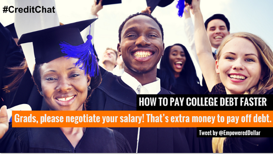 Tweet: “Grads, please negotiate your salary! That’s extra money to pay off debt.” @EmpoweredDollar #CreditChat