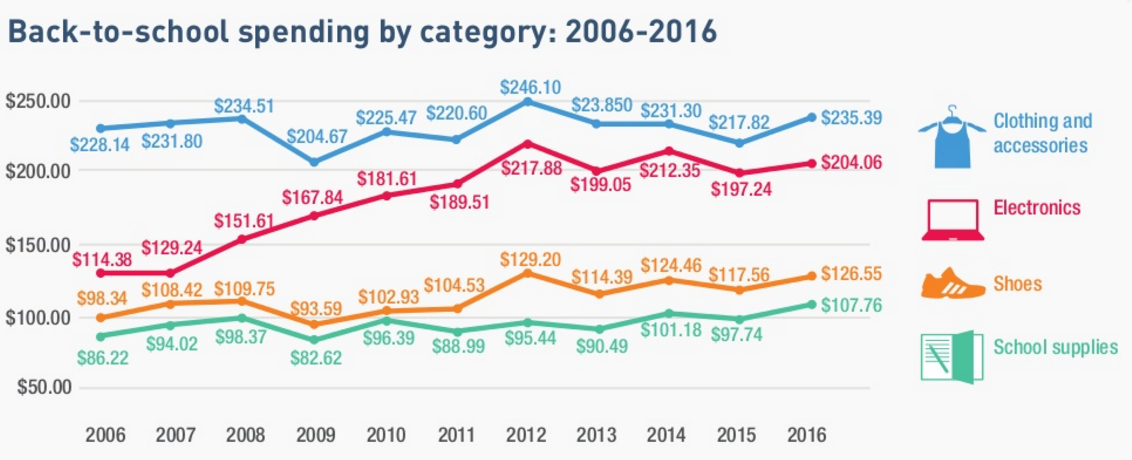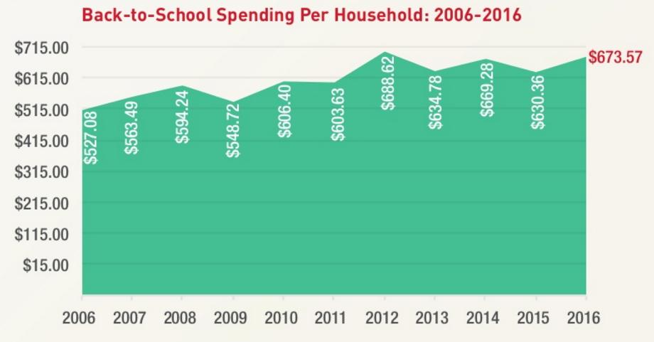 Overall, back-to-school spending is going up from last year — with shoppers spending an average of $673.57 compared to $630 last year (National Retail Federation 2016 Survey) .