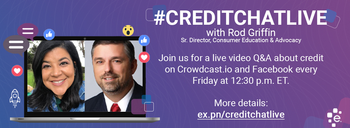 Join Rod Griffin, Experian’s Sr. Director of Consumer Education and Advocacy, for a live credit Q&A every Friday on the Experian News Facebook Page and Crowdcast.io at 9:30 a.m. PT/12:30 p.m. ET.